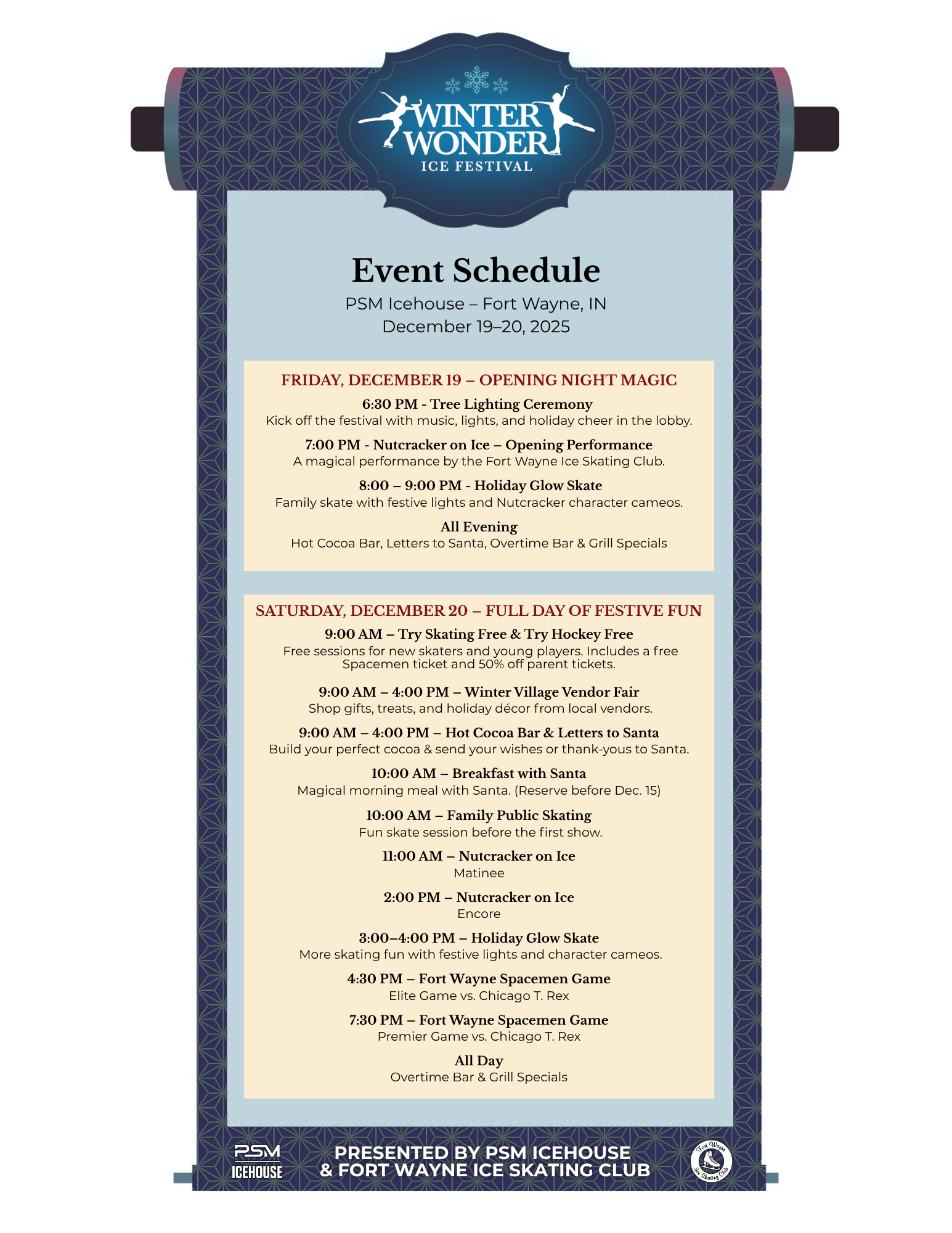 Each December, PSM Icehouse transforms into a Winter Wonderland filled with glowing lights, festive music, and joyful energy. The Winter Wonder Ice Festival brings the season to life with dazzling performances, fun activities, ice skating, and family cheer — all under one roof!